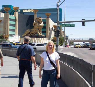 Our walk turned into a hike by the time we were done :) We walked back down the strip and got as far as the Monte Carlo before we crossed over and headed back. (MAP OF STRIP) I was beat by the time we reached the MGM so we decided to do something that just required sitting. There is something called Television City in the MGM where you can give your opinion on a new TV pilot. It was fun and they give you coupons for their store (Yippee a discount on my Survivor T-shirt!). We had dinner at the MGM Grand Buffet which was excellent. But I made Duane hurry a little because I wanted to get back to the room by 8pm to watch Survivor! Hey, that was the only TV we watched the whole time we were there. We topped the night off with a bit of gambling in our casino and across at the NY, NY. I think it was around 1:30pm when we hit the sack. |